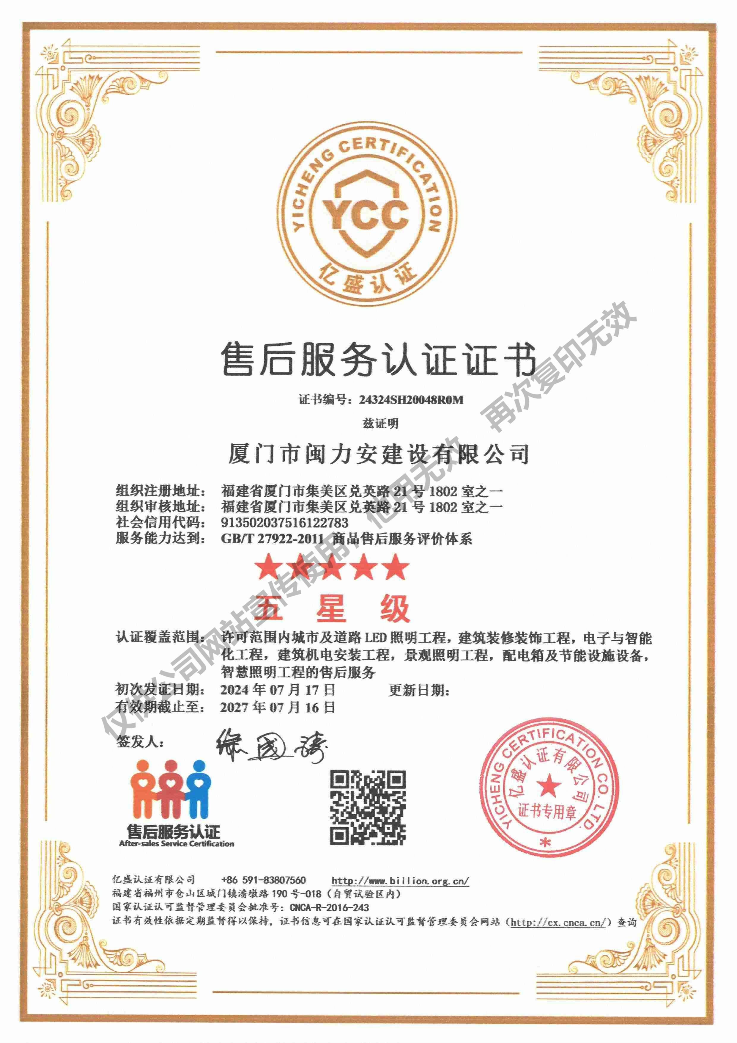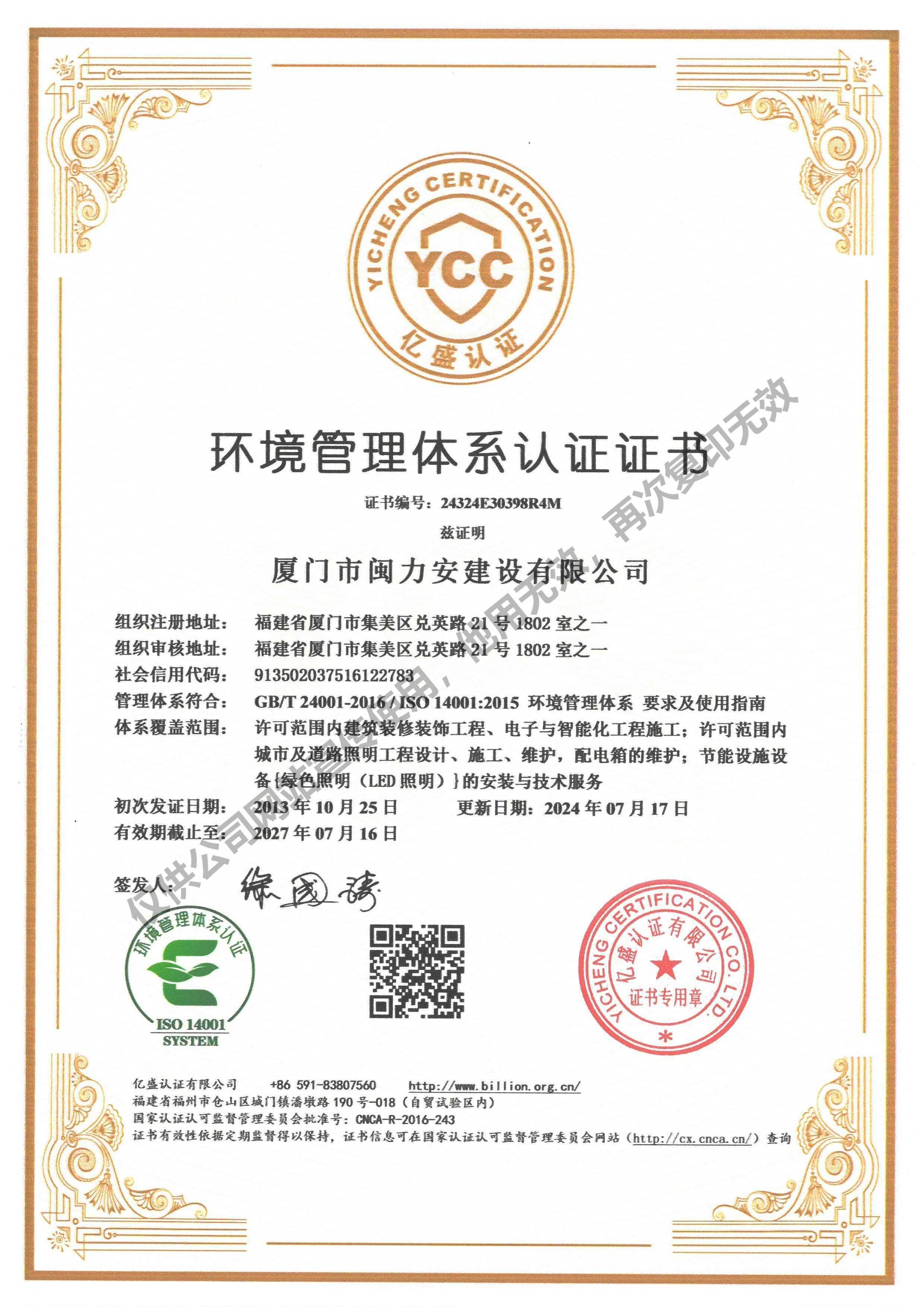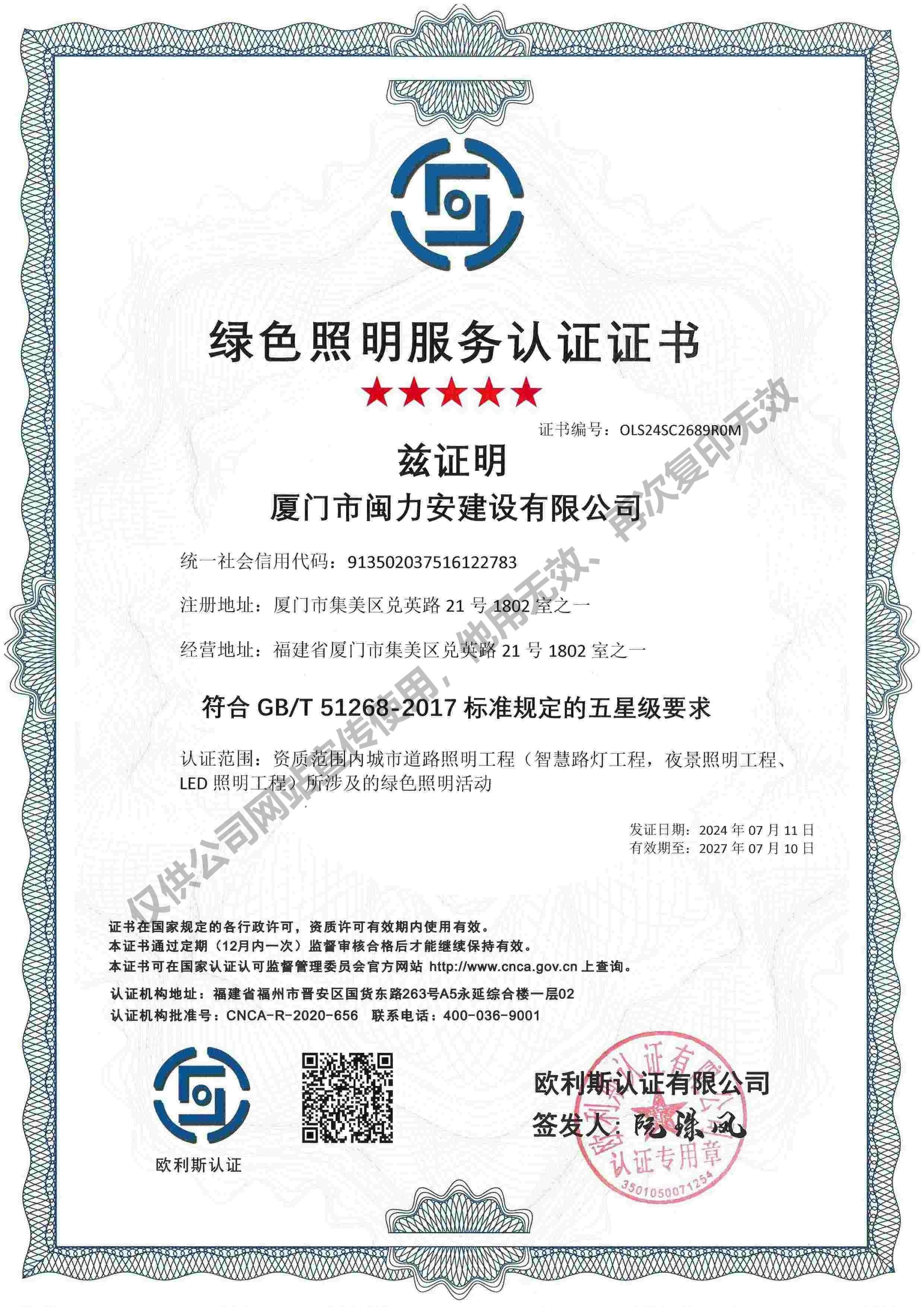 廈門市閩力安建設有限公司成立于2003年,公司取得市政公用工程施工總承包貳級、建筑裝修裝飾工程專業(yè)承包壹級、城市及道路照明工程專業(yè)承包壹級、電子與智能化工程專業(yè)承包貳級、消防設施工程專業(yè)承包貳級、電力工程施工總承包叁級、建筑機電安裝工程專業(yè)承包叁級、輸變電工程專業(yè)承包叁級、環(huán)保工程專業(yè)承包叁級、照明工程設計專項甲級、建筑裝飾工程設計乙級、施工勞務等資質(zhì)的綜合型企業(yè),公司于2013年通過了ISO9001質(zhì)量體系認證,ISO14001環(huán)境管理體系認證,OHSAS18001職業(yè)健康安全管理體系認證。